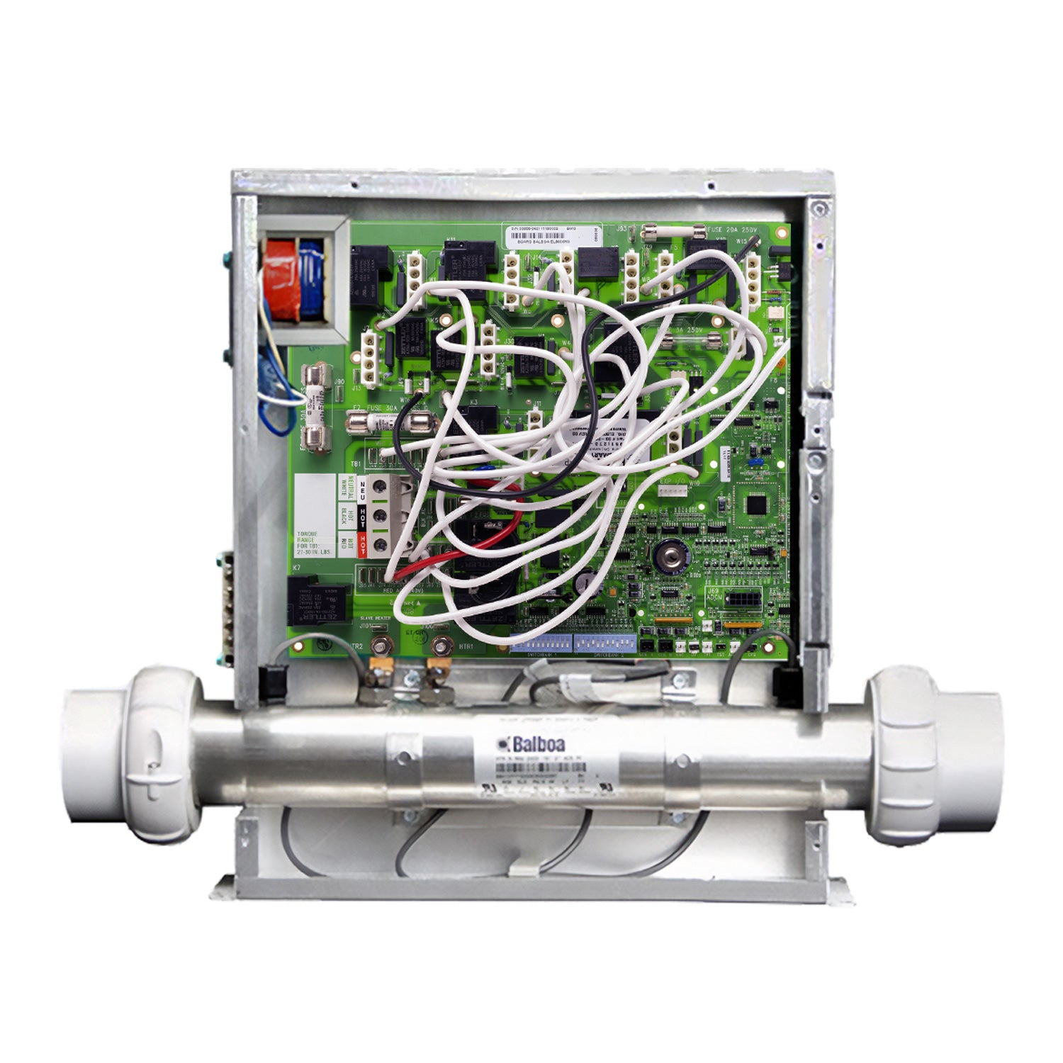 Balboa® Printed Circuit Board (PCB) for Balboa Model EL8000 M3 hot tub control systems. Supports 2-speed primary, secondary, & tertiary pumps, blower, circulation (circ) pump, ozonator/UVC, stereo, mister, & light/fiber optics.